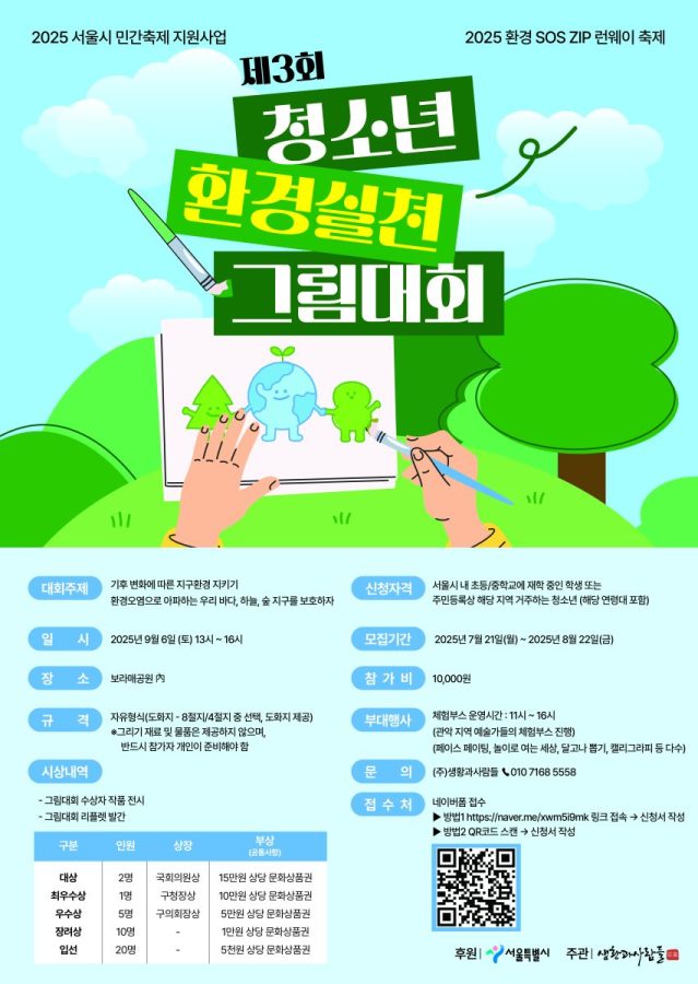 ㈜생황과사람들(대표 홍기숙)이 주최·주관하고 서울시가 후원하는 ‘제3회 청소년 환경실천 그림대회’가 오는 9월 6일 보라매공원에서 개최된다.